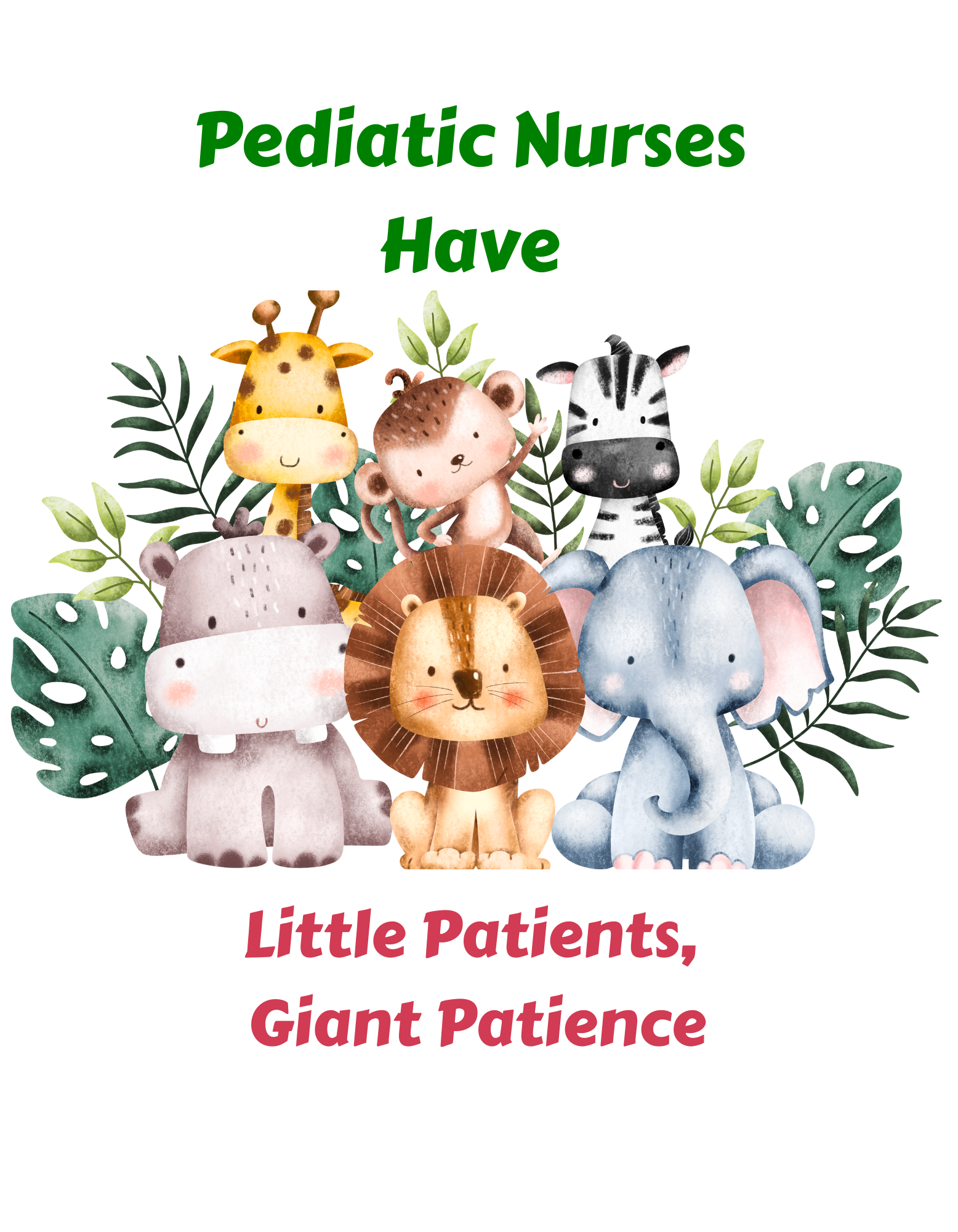 This delightful t-shirt features a colorful, cartoon-style illustration that perfectly captures the warmth and care of pediatric nurses. The phrase "Pediatric Nurses Have Tiny Patients, Giant Patience" is proudly displayed above and below a group of adorable baby animals, including a playful monkey, a charming zebra, a brave lion, a gentle elephant, a tall giraffe, and a happy hippo. Set against a bright and sunny backdrop with cheerful clouds and a smiling sun, this design celebrates the big-hearted patience of nurses who care for the tiniest patients. Made from soft, breathable fabric and available in a variety of sizes, this shirt is a sweet tribute to pediatric nurses everywhere—ideal for work, casual wear, or as a thoughtful gift.